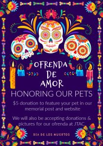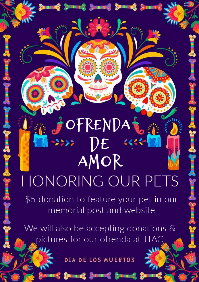 Join us as we celebrate Día de los Muertos with a heartfelt tribute to the pets who have touched our lives. Our event, “Ofrenda de Amor: Honoring Our Pets,” invites the community to remember and honor their beloved companions while supporting the animals currently in our care.