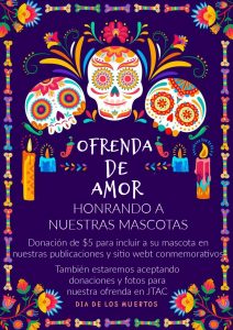 Acompáñenos para celebrar el Día de los Muertos con un homenaje a las mascotas que han tocado nuestras vidas. Nuestro evento, “Ofrenda de Amor: Honrando a Nuestras Mascotas”, invita a la comunidad a recordar y honrar a sus queridos compañeros mientras apoyamos a los animales que cuidamos hoy en día.